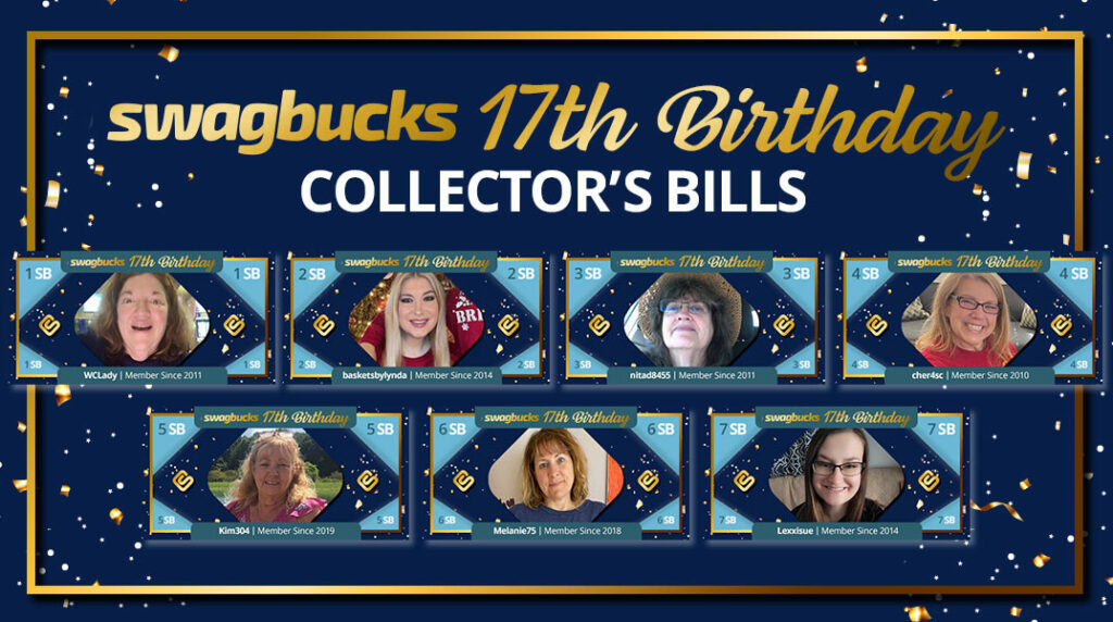 It’s Party Time, Swaggernauts—It’s our Birthday week and Collector’s Bills are BACK, celebrating the amazing people who make this website possible—YOU! On our Facebook, we asked members to share their Rewarding Moments made possible with Swagbucks and selected 7 members to be featured on our Birthday Collector’s Bills!