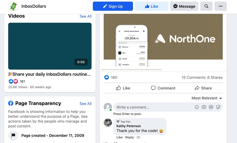 On InboxDollars, for example, you can see that InboxDollars has been active on Facebook since December 11, 2009.