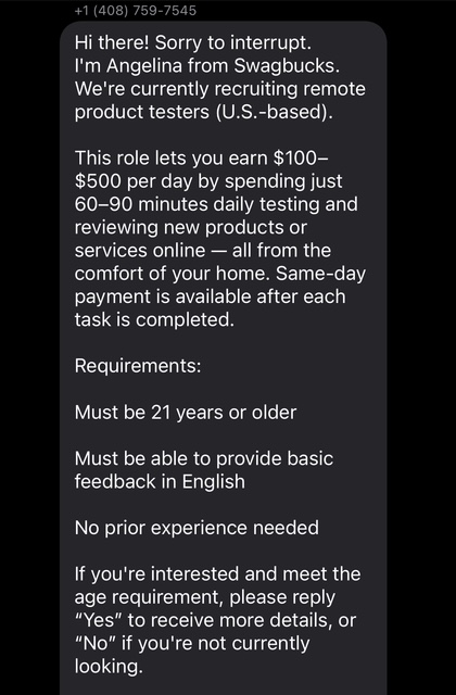 Fraudulent text messages claiming to be from Swagbucks have been circulating, offering fake job opportunities and requesting personal information. These messages are NOT from us. Here’s what you need to know: